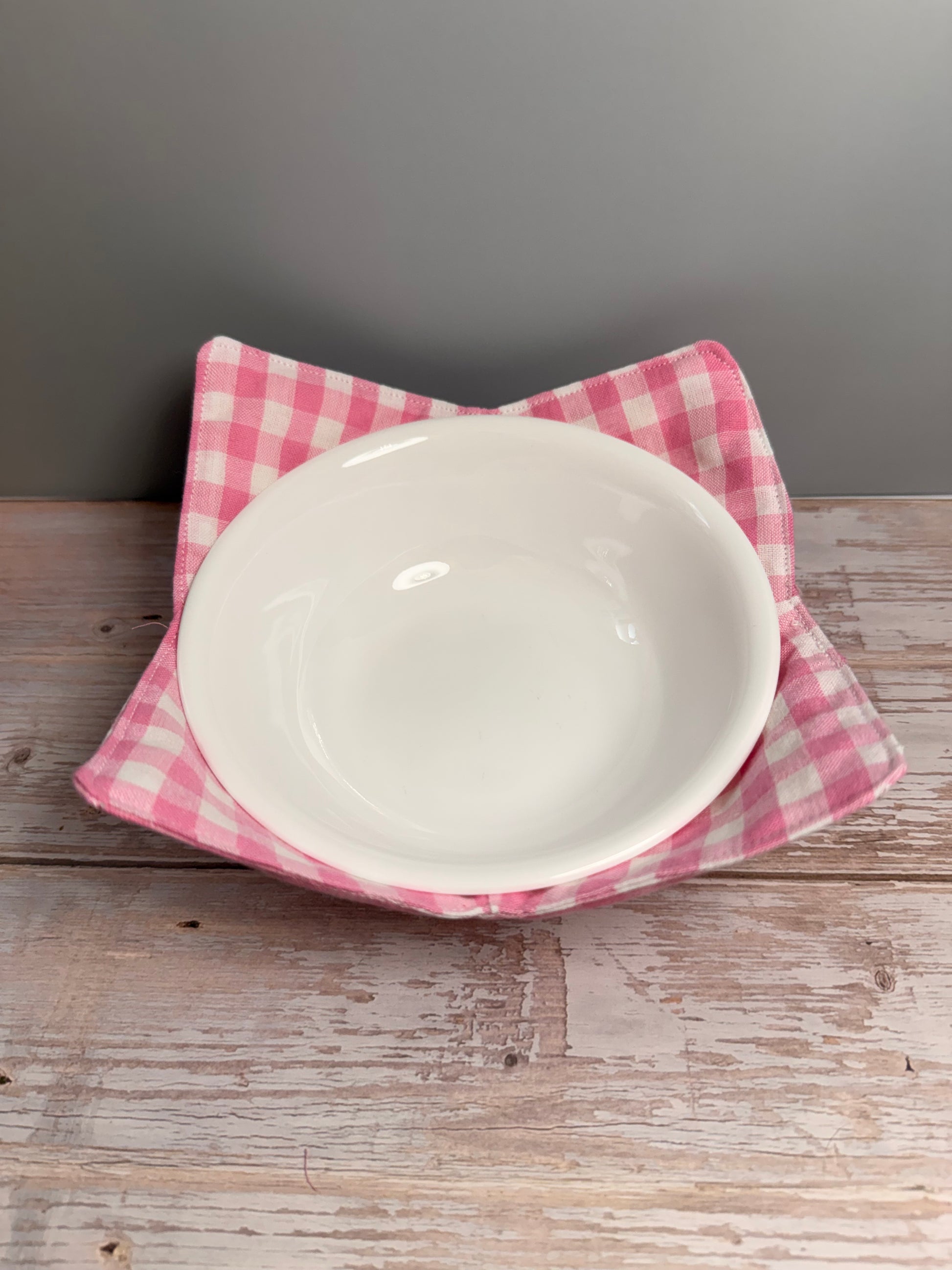 Make mealtime cozy and stylish with this set of 4 handmade bowl cozies in adorable pink gingham! Perfect for protecting your hands from hot soup or cold ice cream, these microwave-safe cozies are a must-have kitchen accessory.