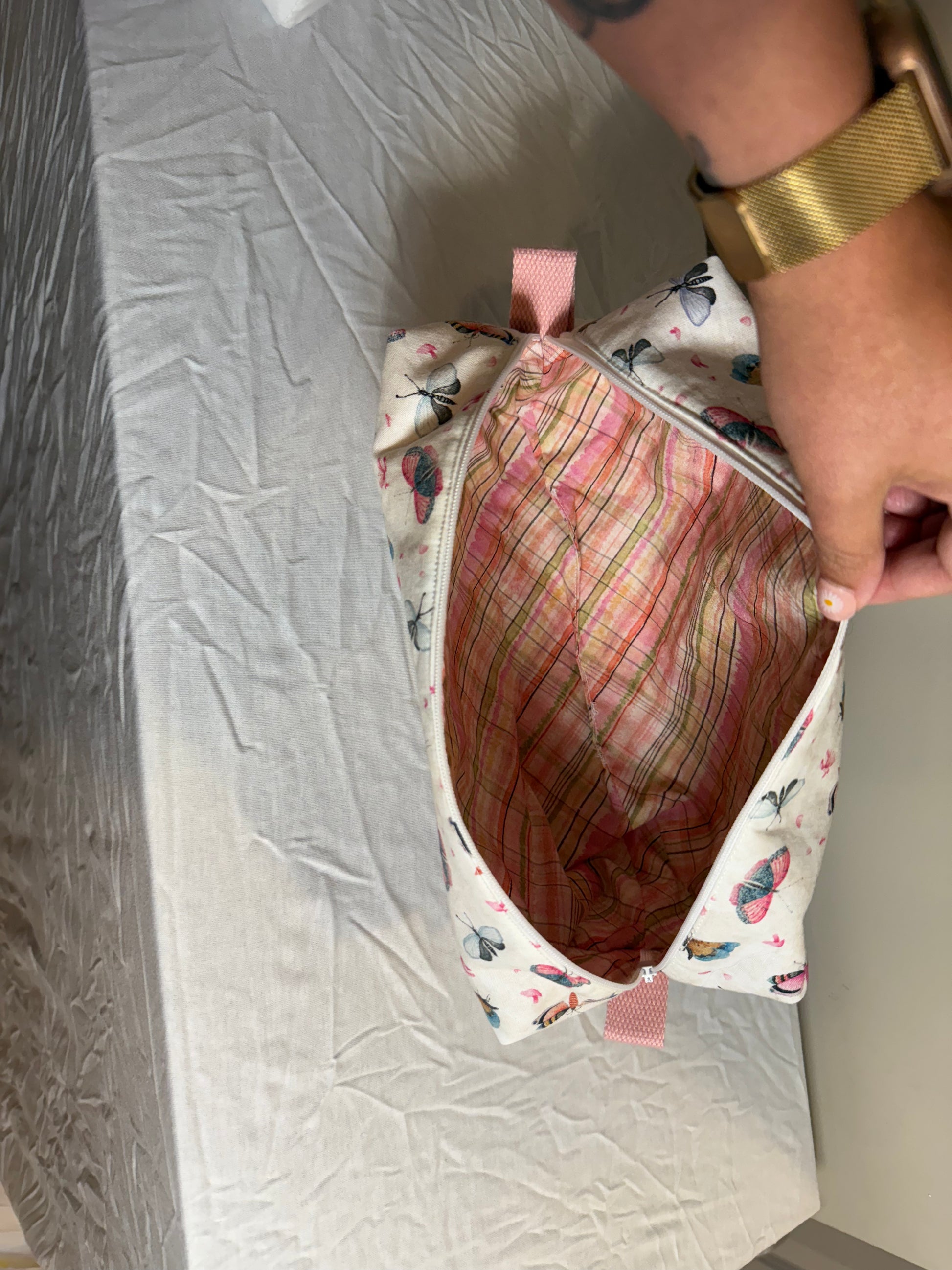 Keep your everyday essentials organized in style with this charming handmade zipper pouch! Featuring a whimsical butterfly print on the outside and a warm plaid interior, this soft yet structured bag is perfect for stashing makeup, pens, travel items, or craft supplies.