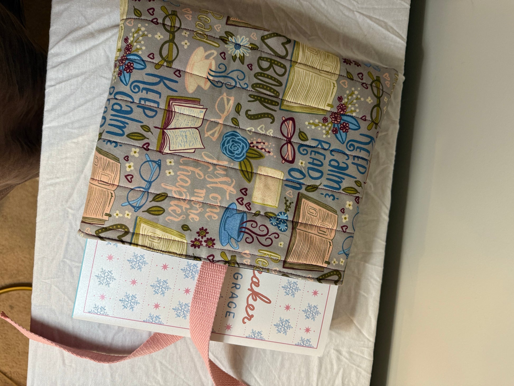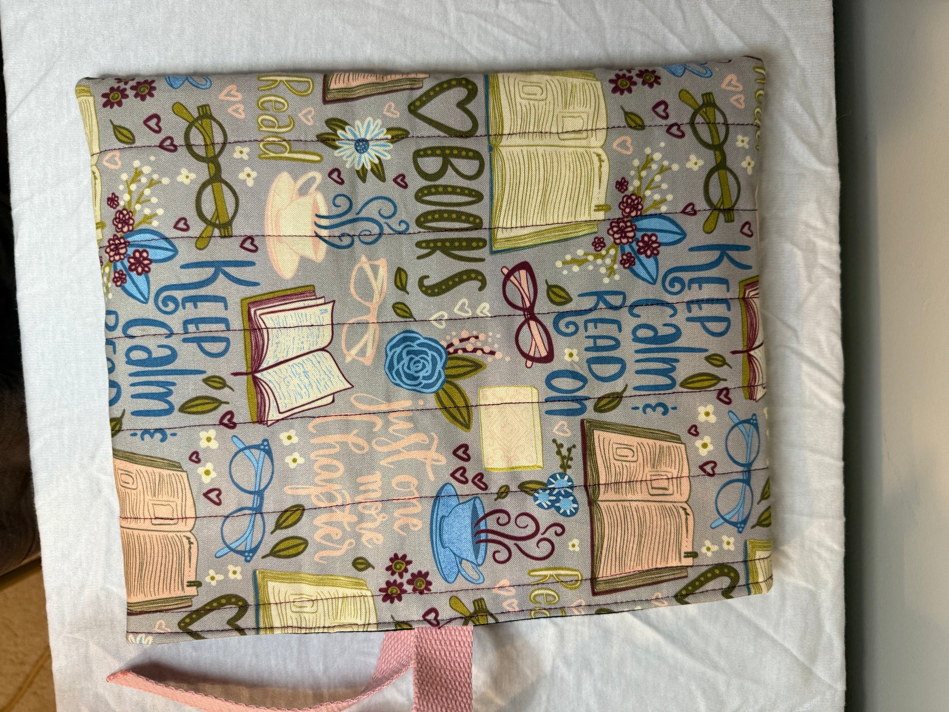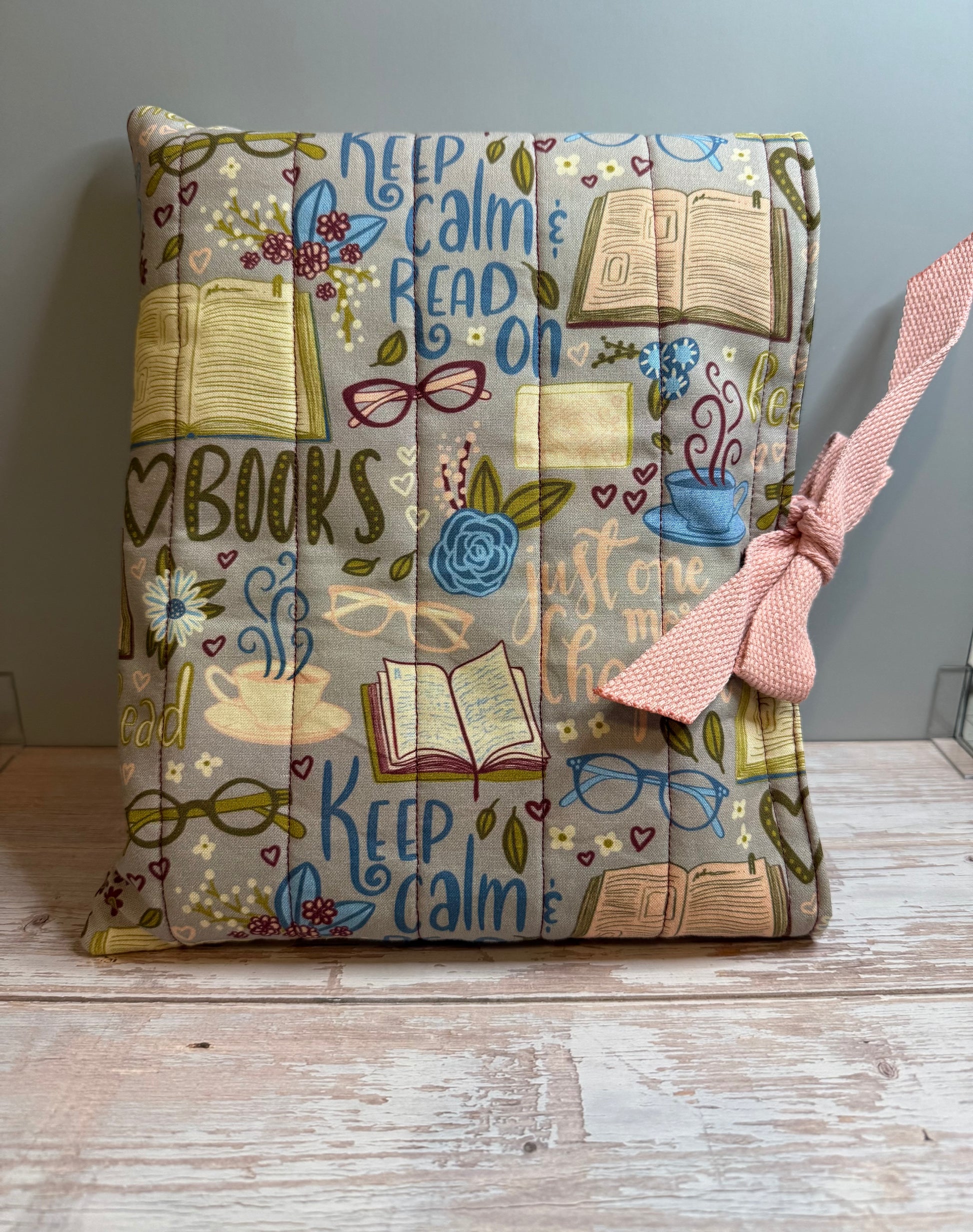 Protect your favorite reads in style with this handmade padded book sleeve, featuring a charming bookish print covered in glasses, open books, flowers, and cozy quotes like “Keep Calm & Read On” and “Just One More Chapter.”